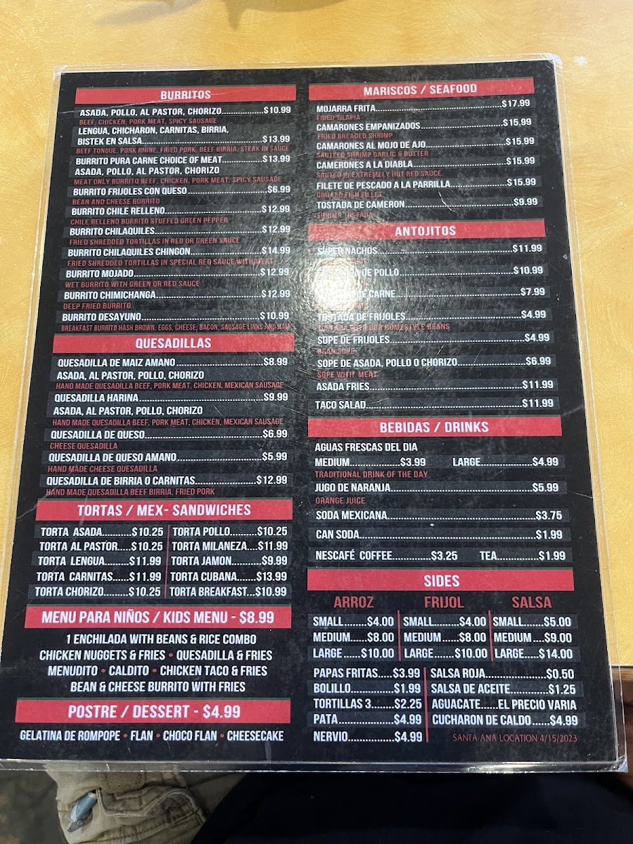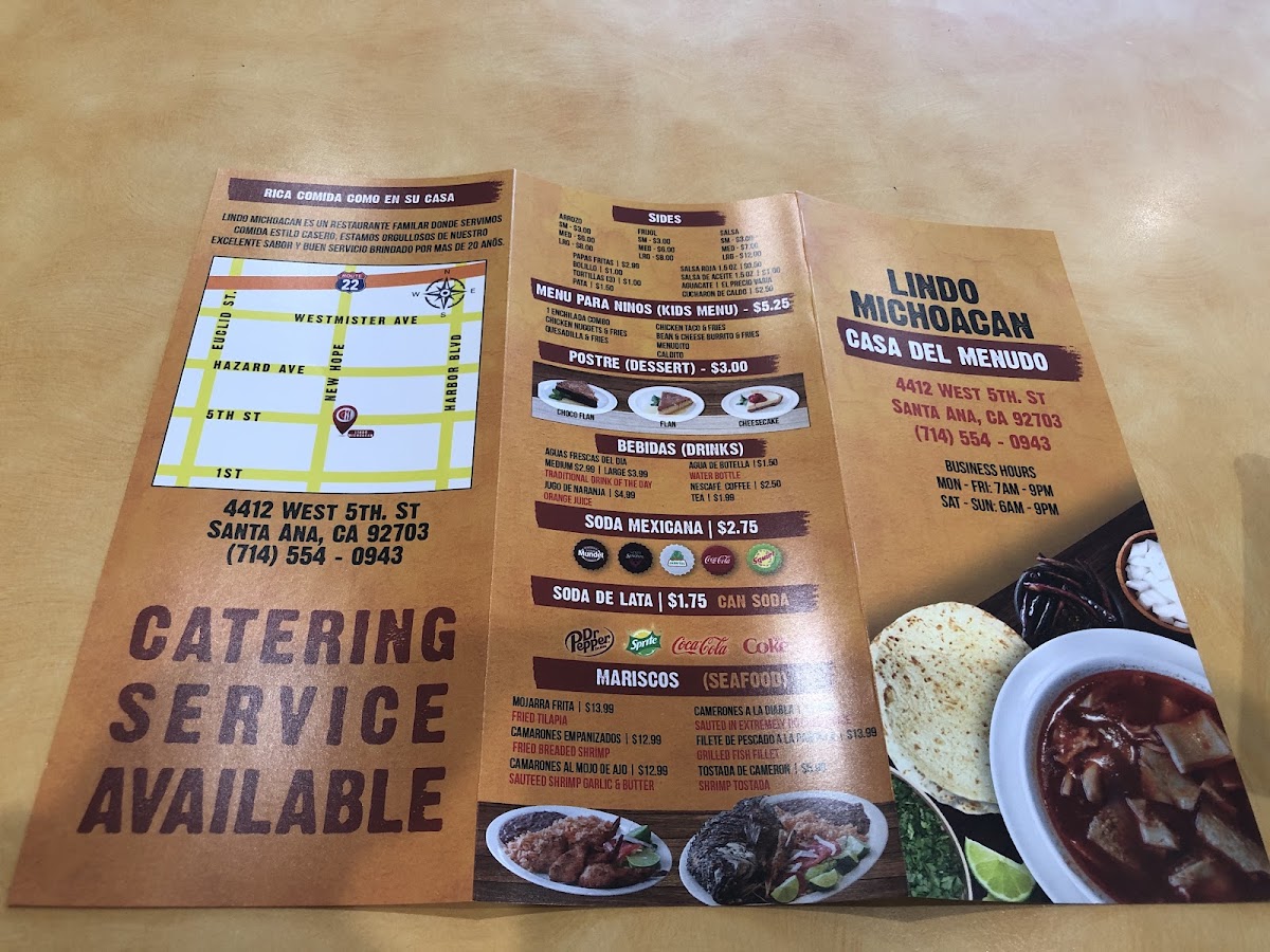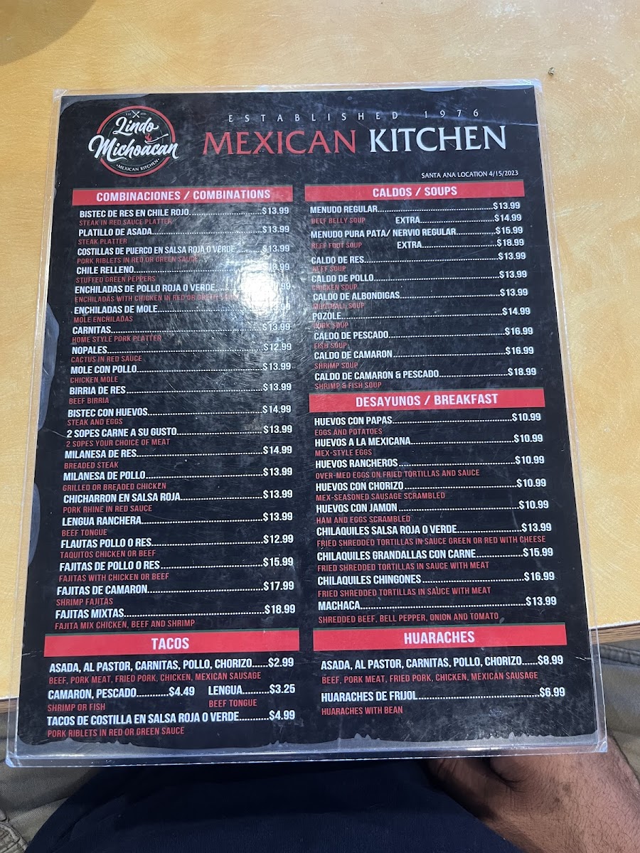 Welcome to Lindo Michoacan, a hidden gem in Santa Ana, CA, known for its authentic Michoacan cuisine. Nestled at 4412 W 5th St, this cozy restaurant invites you to indulge in a menu that sings with flavors from Mexico's heart. Begin your culinary adventure with the handcrafted Quesadillas Amano de Carne, or savor the mouthwatering Al Pastor Taco for just $1.99. For heartier options, the Chimichanga deep-fried burrito ($8.25) is a standout, embodying comfort and tradition.